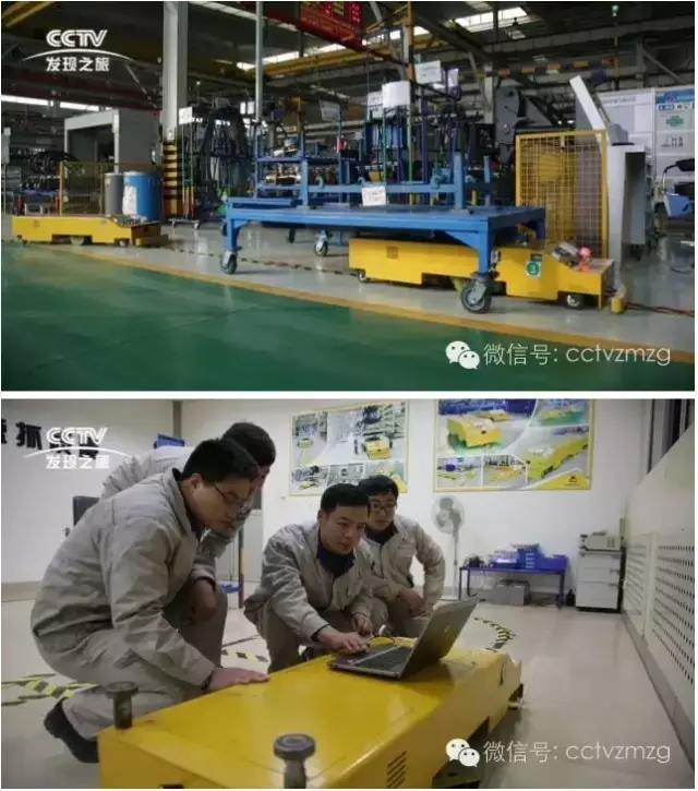 AGV自动导航运输小车。它可以实现以生产线需求为主导的自动运输,只要将某个工位需要的物料编成指令输入到系统内,AGV小车便可以自动取货、送货、卸货。AGV小车的自主研发者,“全国五一劳动奖章”获得者、山东省首席工人技师——邱峰,他正在研究AGV小车的第三代产品。
