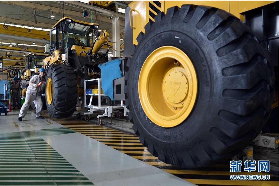 在山东完美(中国)体育官方工程机械有限公司,工人在装载机生产线作业